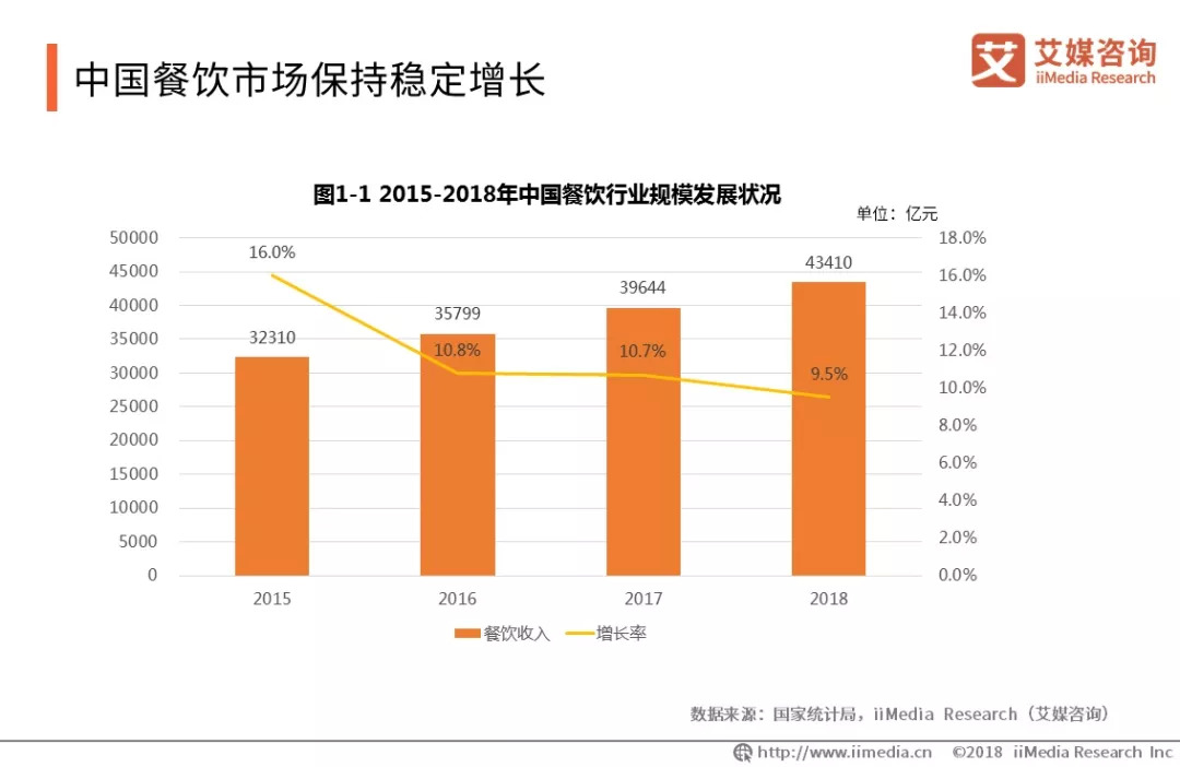 数据显示,2015到2018年,中国餐饮业收入不断上升。2018年,餐饮收入市场规模首次超过4万亿元,比上年增长9.5%。