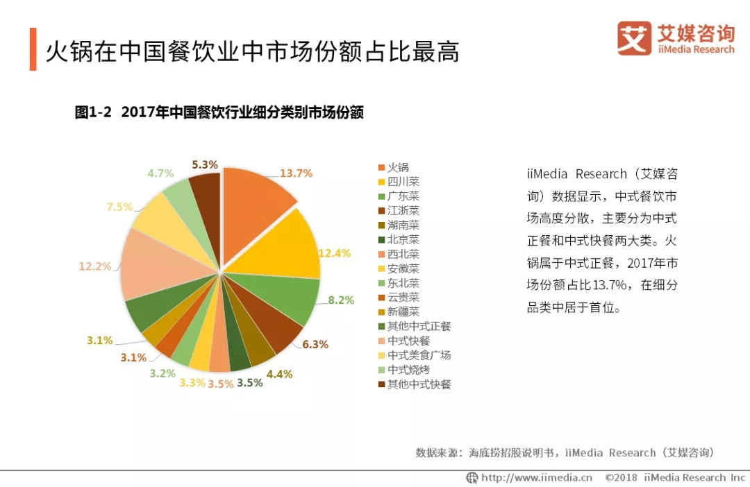 中式餐饮市场高度分散,主要分为中式正餐和中式快餐两大类。火锅属于中式正餐,2017年市场份额占比13.7%,在细分品类中居于首位。
