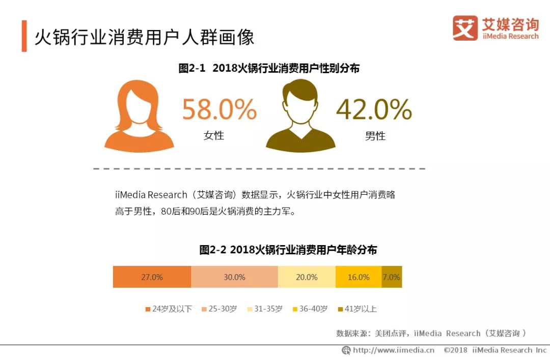 火锅行业中女性用户消费略高于男性,80后和90后是火锅消费的主力军。