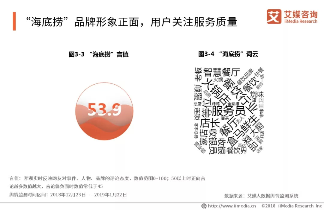 数据显示,系统监测期间智慧体育的言值数据为53.9,整体舆论偏正向。艾媒咨询分析师认为,海底捞通过广告宣传、门店服务和舆情回应等举措树立了一个正面的品牌形象。据词云显示,大部分词语围绕着餐厅人员和菜品选取,表达了消费者对服务质量的关心。同时,智慧餐厅也是人们关心的话题。