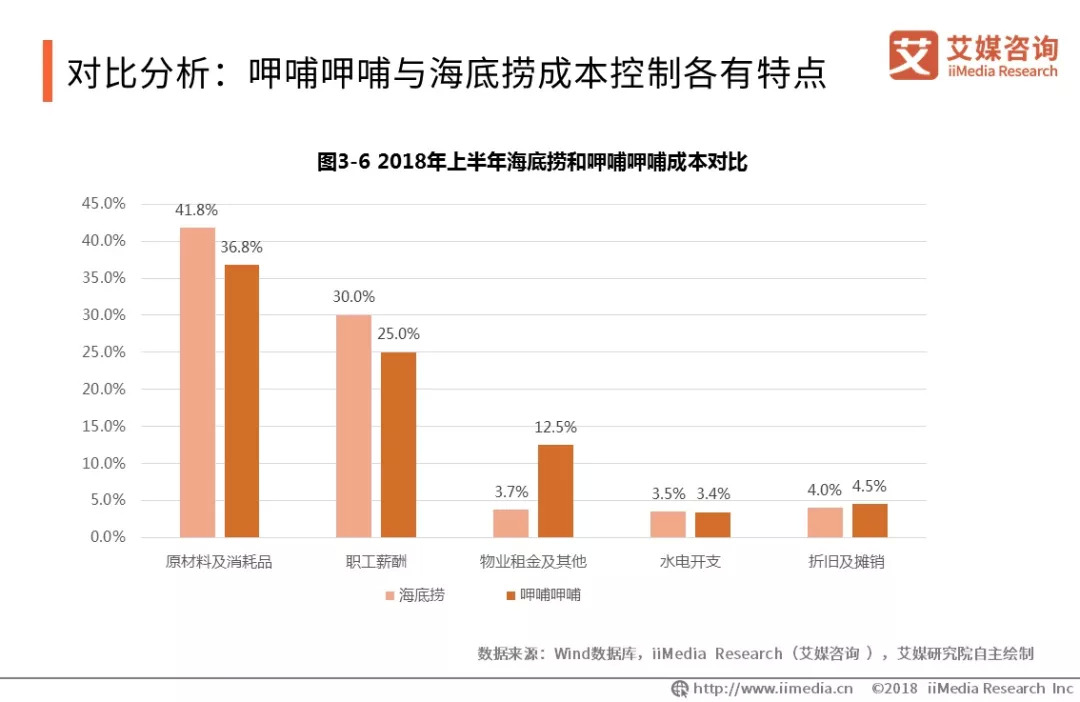 2018年上半年海底捞(41.8%)相较呷哺呷哺(36.8%)原材料成本更高。并且,海底捞注重服务体验,员工成本高于呷哺呷哺。艾媒分析师认为,由于海底捞自身具有很高的用户吸引力,可以为所在商城引入顾客,因此,商场物业租金让利比较多,物业控制明显优于呷哺呷哺。