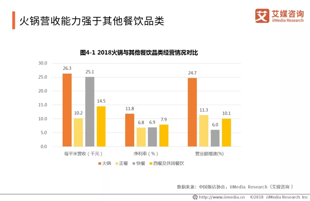 数据显示,火锅每平方米营收为2.63万元,高于其他餐饮品类,净利率为11.0%在餐饮行业中居于首位,营业额更是以24.7%的增速遥遥领先于其他餐饮品类。