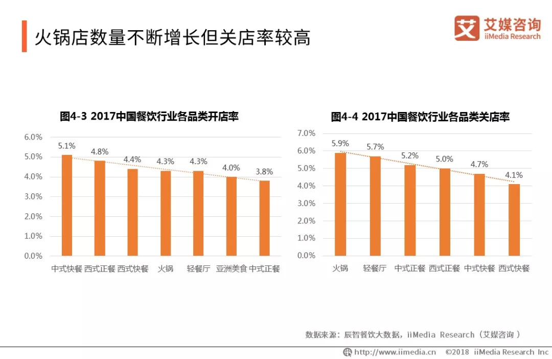 此外,2017各餐饮品类门店数量均呈增长态势,但同时伴随着关店现象。火锅市场竞争激烈,关店率高于开店率。同时,关店率为5.9%,在餐饮行业中居于首位。