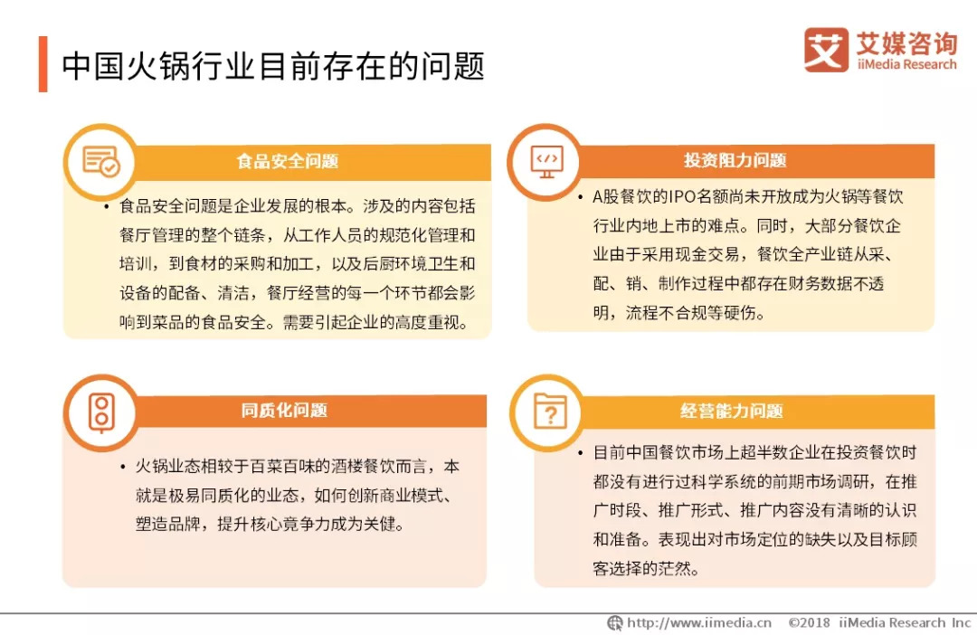 艾媒数据总结出四个方向的问题:食品安全、投资阻力、同质化、经营能力。