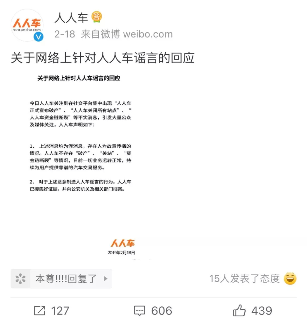 人人车各项业务正常开展,对恶意造谣行为已搜集证据,向公安机关及相关部门报案。