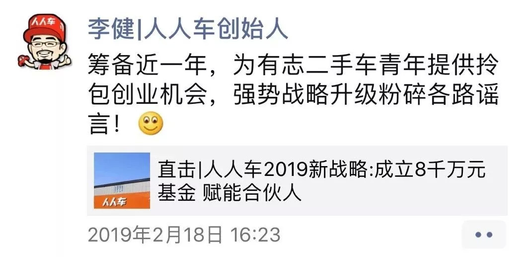 2月18日,人人车创始人兼CEO李健向全员发送内部信,启动了一场“新平台,新零售”为主题的战略升级。在整个行业通过蛰伏的方式对抗外界动荡时,人人车开始了围绕资源、效率、能力的调整。不追求经脉逆行破旧立新,却有激发活力面目焕然之功效。如何快速呈现如此功效,这才是人人车当务之急。