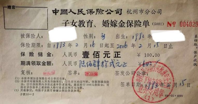 你看这个教育金保险,当年1993年100元还是很值钱的,23年后就返了642元,贬值到勉强给孩子买一个书包吧……