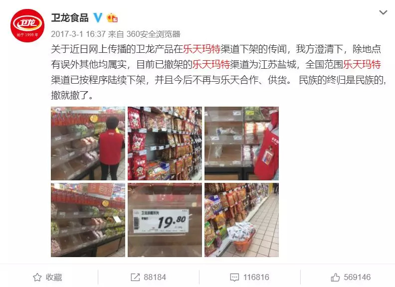 “乐天玛特撤柜事件后,卫龙彻底火了。”一经销商表示。2017年3月,乐天宣布为“萨德”反导系统供地,彼时,国内相关新闻不断。网友一则卫龙从武汉乐天玛特下架成了导火索。卫龙官方微博回应的一句“撤了就撤了”,则成了点燃导火索的火苗。当天,卫龙登上了微博热搜,网友吹捧卫龙,说“卫龙形象2米8”。