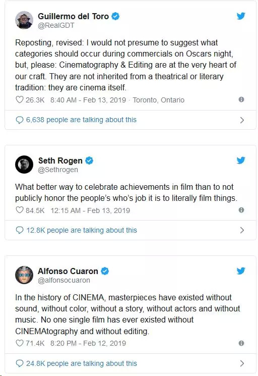 最终迫于多方压力,美国电影艺术与科学学院不得已在2月15日改变了这一决定,对外宣称将会在奥斯卡颁奖典礼上直播所有奖项,并推特发文写道:“离颁奖典礼还有九天,“剧本”还在修改中。”