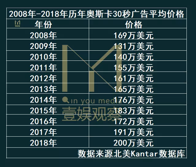 壹娱观察通过对上述表格中的相关年份对比发现,相比2017年,奥斯卡颁奖礼30秒广告的平均价格为191万美元,2018年的这一数字上涨了5%。2017年又比2016年的172万美元平均价格上涨了11%。