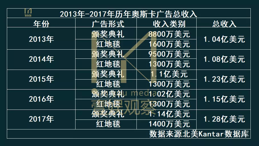 通过表格不难发现,正如前文所说颁奖典礼的广告费用占据了绝大部分,红地毯仪式的广告收入始终维持在2000万美元以下。而从近年奥斯卡颁奖典礼广告收入表格中也不难看出,除2016年出现些许疲软,有了近15%的下降,总体来说奥斯卡颁奖典礼广告收入在近年都呈上升趋势。