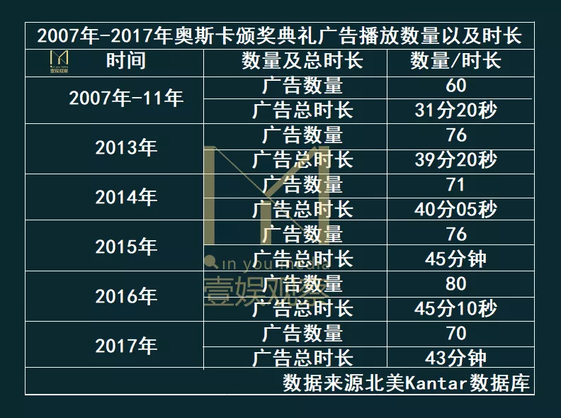 根据Kantar数据显示,虽然近些年每届奥斯卡颁奖典礼有接近70-80个广告,但排名靠前几位的广告赞助商基本上占据了当年奥斯卡广告总收入的55-60%。