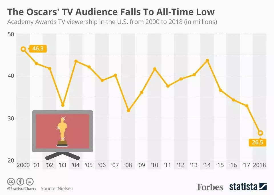 不过,奥斯卡颁奖典礼的广告收入、广告席位虽然不断创造新高,但是颁奖典礼的收视率却在逐年走低。根据Forbes相关数据显示,2018年奥斯卡颁奖典礼仅吸引了2650万观众观看,比2017年的3290万人下降了20%。这一届的收视率也刷新了2008年乔恩·斯图尔特主持的第80届奥斯卡颁奖典礼时仅有3180万观众收看的历史最低收视纪录,成为奥斯卡颁奖史上的新低。