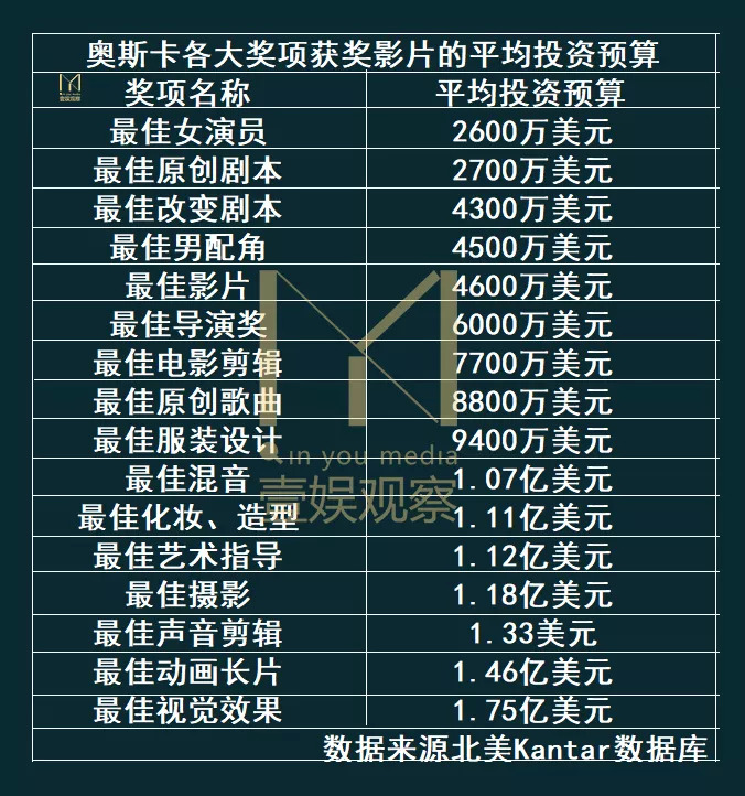 从表格中不难发现表演类奖项投资预算相对较少,而偏向技术性的奖项,如最佳视觉效果、最佳动画长片、最佳艺术指导等奖项,必须依靠比较庞大的投资的预算才能在这个奖项中保有一定的竞争能力。