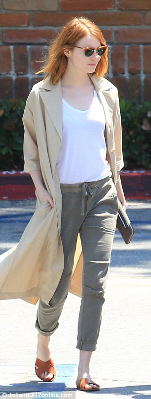 艾玛看上去容光焕发,披散着如同烈焰般的头发,也没有刻意去打理。这位出演《超凡蜘蛛侠》的女演员戴着一副时尚墨镜,身上套了一件浅米色的长外套。安德鲁则似乎为了这次出行,一改平日的轻松状态,特意打扮了一番。除了稀疏的胡须十分抢眼,安德鲁还对自己的发型下了一番功夫,将他的一头棕发向后捋顺。