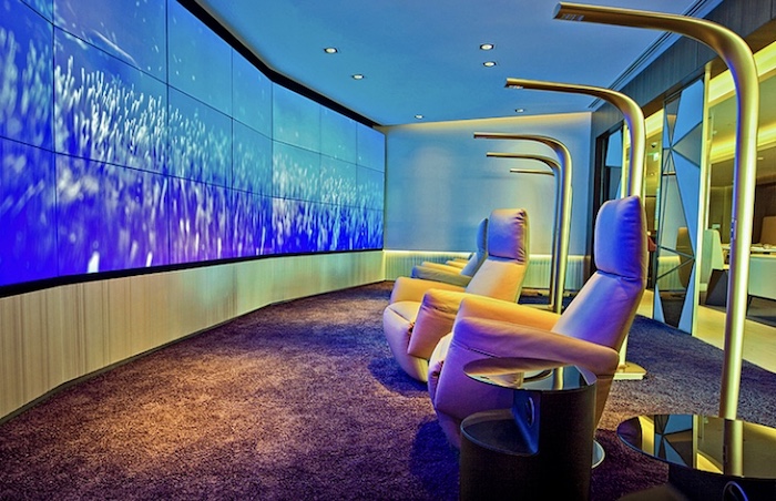 客舱入口改变了登机体验,让登机过程更像步入了一家精品酒店。厨房可以被90度旋转,从而形成一处“后厨”区,对面还有两块屏幕,欢迎着人们的到来,这儿俨然成为了一处摆满了文化艺术品的精品酒店大堂了。