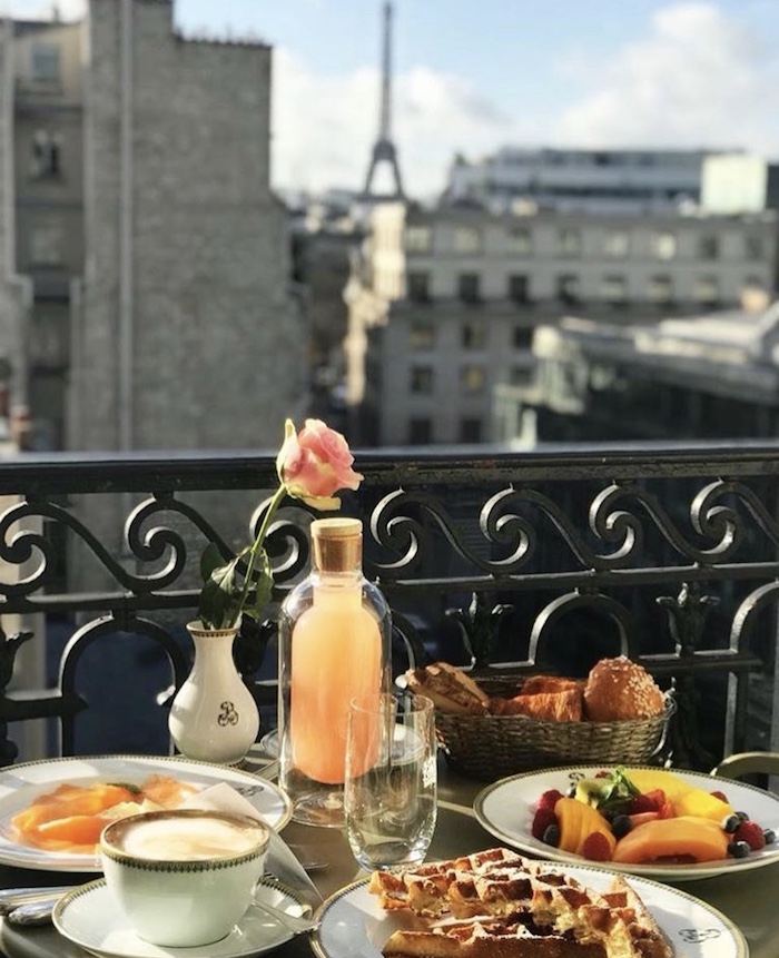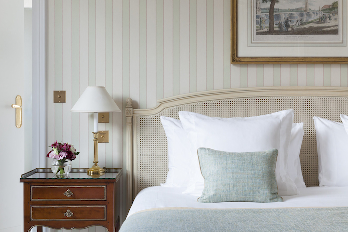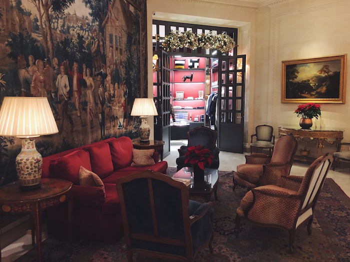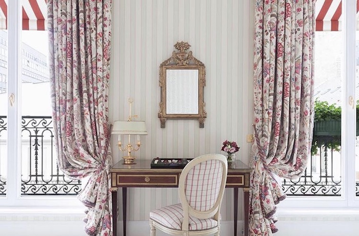 这家1925年开业的宫殿酒店,就坐落在爱丽舍宫(总统府)斜对面一座19世纪奥斯曼风格的大楼里,面前那条狭窄的街道——圣奥诺雷街,却是巴黎时尚的中心,云集了几乎全球所有知名大牌。一进酒店就感觉周围散发出了一股浓浓的法式复古风味,水晶吊灯、波斯地毯,还有房间里每一幅真迹原作的挂画,美到不舍得挪开脚步。