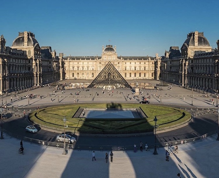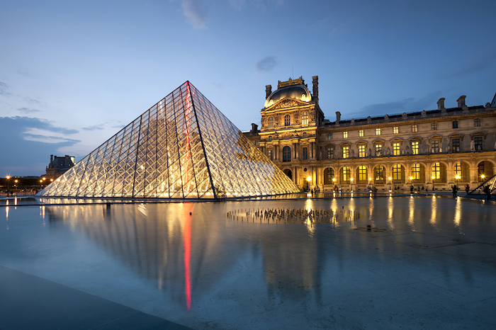 卢浮宫前的金字塔形玻璃入口,是华人建筑大师贝聿铭设计的。他在设计中采用了玻璃材料,金字塔耸立在庭院中央,可以反映巴黎不断变化的天空,还能为地下设施提供良好的采光,创造性地解决了把古老宫殿改造成现代化美术馆的一系列难题,取得了极大的成功,享誉世界。