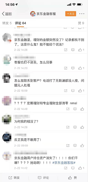 2月22日下午,多名投资者在微博反映称,在没有进行任何人为操作的情况下,自己在京东金融App中的理财资产被系统清零。