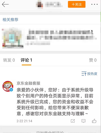 截至记者发稿,京东金融客服官方微博并未在首页做出统一回应,而是对每位网友的相关微博逐一回复。京东金融客服表示,本次事件是系统升级导致个别用户的持仓页面显示异常,目前系统升级已完成,用户资金和收益不会受到影响。