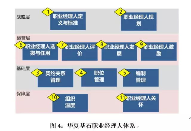 有句老话,“火车跑得快,全凭车头带”。国有企业的发展说到底离不开有效的干部队伍;而干部队伍中,为企业发展起到至关重要作用的是企业经营管理人才。自《2002 - 2005年全国人才队伍建设规划纲要》中提出“努力建设高素质、职业化的企业经营管理人才队伍”以来,针对职业经理人,国家已出台十几项相关政策,对职业经理人选聘、薪酬、转换、考核与退出等各方面都做了规定,但成效并不明显。我们认为,在优化法人治理解放企业家和职业经理人手脚的基础上,必须进一步建立起职业化的干部体系(图4为华夏基石职业经理人体系),才能有效保障企业整体改革的转型与升级。