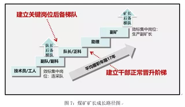 --提供人才发展服务。仅仅依靠人才自然生长当然是不够的,企业要建立起帮助人才快速成长的服务体系,为人才学习和发展提供资源、方法、专业人员和机制的保障。人才发展服务建立在人才标准的基础上,必须依据人才标准建立相应学习发展计划,才有可能收到实效。举个例子,我们发现神东煤炭集团绝大多数优秀矿长都做过技术员、连采综采或掘进队队长、生产副矿长等岗位,在分析这些岗位与矿长岗位的资格标准基础上,我们提出优秀矿长的发展路径(详见图7)。正常情况下,一位优秀矿长需要经历若干关键岗位,平均履职17年;而为加速成长,需要在关键岗位建立后备梯队,通过培训授课、行动学习、项目历练、轮岗培养等“训战结合”的方式,依据人才标准迅速丰富其知识,增加其历练,培养其潜能,从而大大缩短其成长周期。