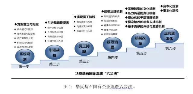 我们自2014年以来,参与了数十起国有企业改革案例,在研究和实践经验总结的基础上,提出华夏基石国企改革的“六步法”模型(见图1),涵盖了系统规划制定方案、引进战略投资者、实现员工持股、规范治理、机制改革与创新,以及走向资本化六个步骤。