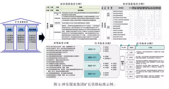 图5是2014年我们为原神华集团神东煤炭集团公司制定的矿长资格标准示例。该资格标准从知识技能、行为和历练三个方面,对优秀矿长的特有素质做了总结和提炼。知识技能方面,煤炭行业涉及地质、水文、机电、机械等26个专业,作为矿长都应该有所了解,现有社会与职业教育难以完成这方面工作,因此,我们将其工作中应用到的知识技能分为专业知识、管理知识、法律法规和公司制度四大类别、24个子类别、上百个知识项目和数千个知识模块,形成以矿长为典型岗位的较为专业的煤炭经营管理人员知识技能库;并根据矿领导班子成员各自分工,按了解、熟悉、掌握、精通四种程度做了区分。行为方面,我们从管理自我、管理团队、管理业务和管理协作四个方面,总结提炼出优秀矿长普遍具有的14条基本行为标准,将其细化为几十条素质要项,并分别做了行为描述;还配以公司内部的典型案例与事件故事,以便于传承和学习。历练方面,针对以矿长为首的领导班子日常工作可能遇到的基本场景,总结提炼了16项历练场景。