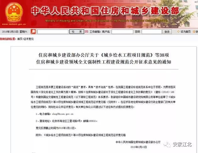 日前,住房和城乡建设部下发“住房和城乡建设部办公厅关于《城乡给水工程项目规范》等38项住房和城乡建设领域全文强制性工程建设规范公开征求意见的通知”。