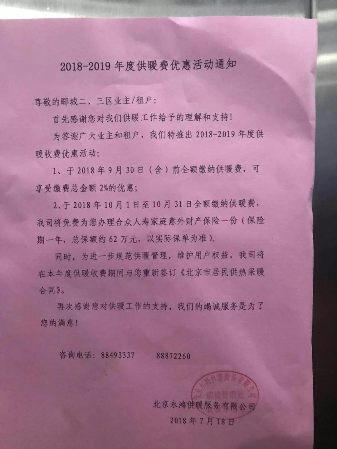某小区内张贴的收取供暖费通知。
