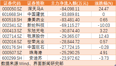 在本周主力资金持续净流出个股中,共计34只个股累计主力资金净流出额超过1亿元。这其中,深天马(000050.SZ)、中国建筑(601668.SH)、康美药业(600518.SH)等个股本周遭主力抛售幅度最大,其累计净流出额分别为8.41亿元、8.39亿元、8.35亿元。