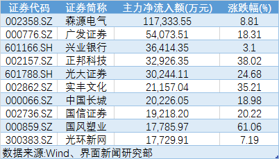 Wind提供的数据显示,本周获主力资金持续净流入且五日累计净流入额超过1亿元的个股共有19只。其中,森源电气(002358.SZ)、广发证券(000776.SZ)、兴业银行(601166.SH)本周累计净流入额居前,分别为8.81亿元、18.31亿元、3.10亿元。