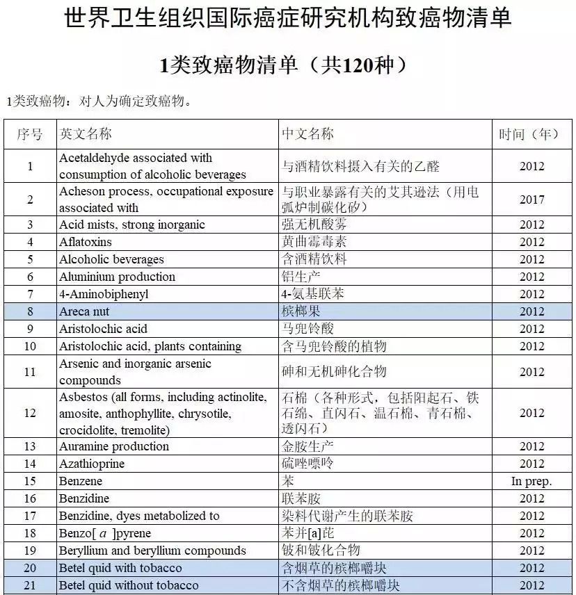 2012年,世界卫生组织又列出一个1类致癌物清单,有三种致癌物质明确与槟榔有关。
