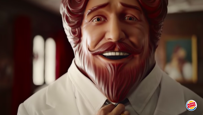 最近汉堡王发布了的广告片中,汉堡王的那个国王角色穿上白色西装,把头发梳成大人模样,戴上了一颗非常显眼的金色戒指——镜头扫到半身,会发现他这一身与肯德基上校的样子非常相似。广告语中汉堡王表示,他们是“KFG——King of Flame Grilling(直火烧烤之王)”。