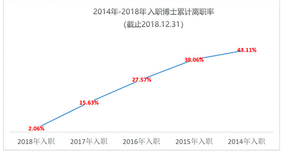 根据华为心声社区官网的数据,华为博士类员工近五年来累计平均离职率高达21.8%,让人意外的是,这些高学历员工入职时间越长累计的离职率越高,2014年入职的博士,到2018年,只有约57%留职。