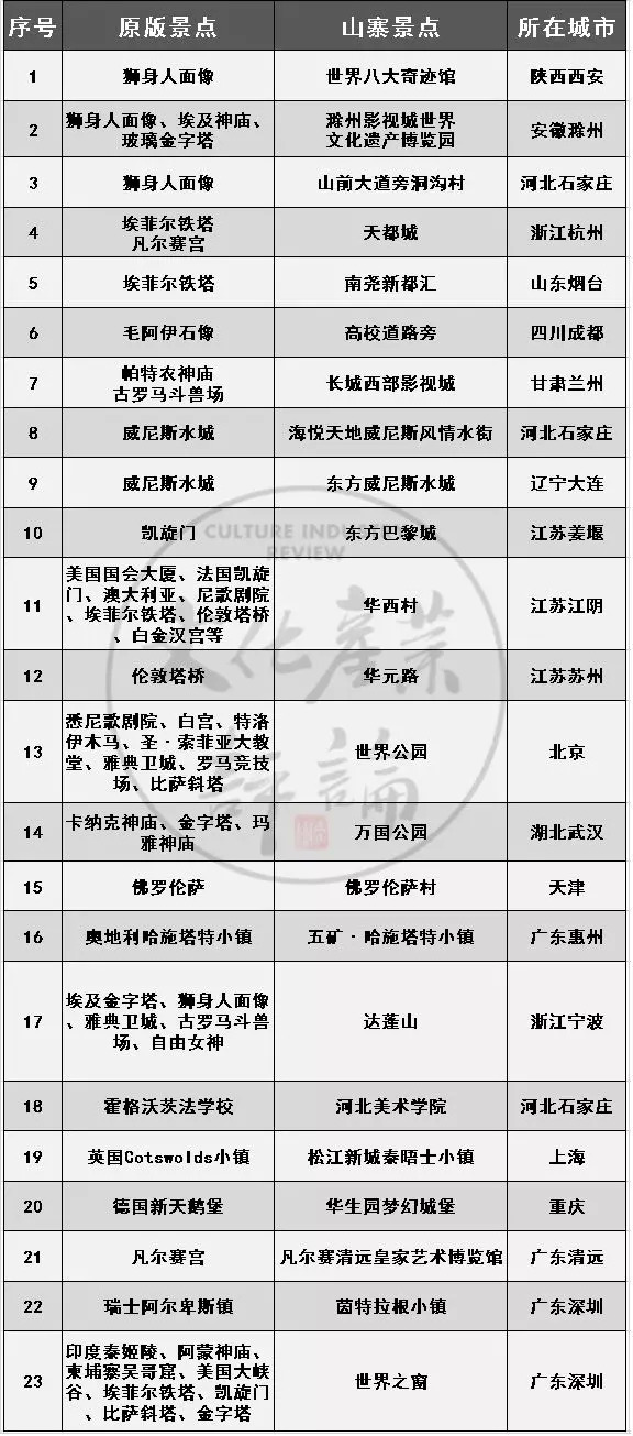 据文化产业评论(whcypl)统计,目前国内山寨国外景点的地方至少有20多处。很多知名景点,比如埃及的狮身人面像、法国的埃菲尔铁塔、意大利的威尼斯水城更是被多个地区山寨,分布在全国各处。
