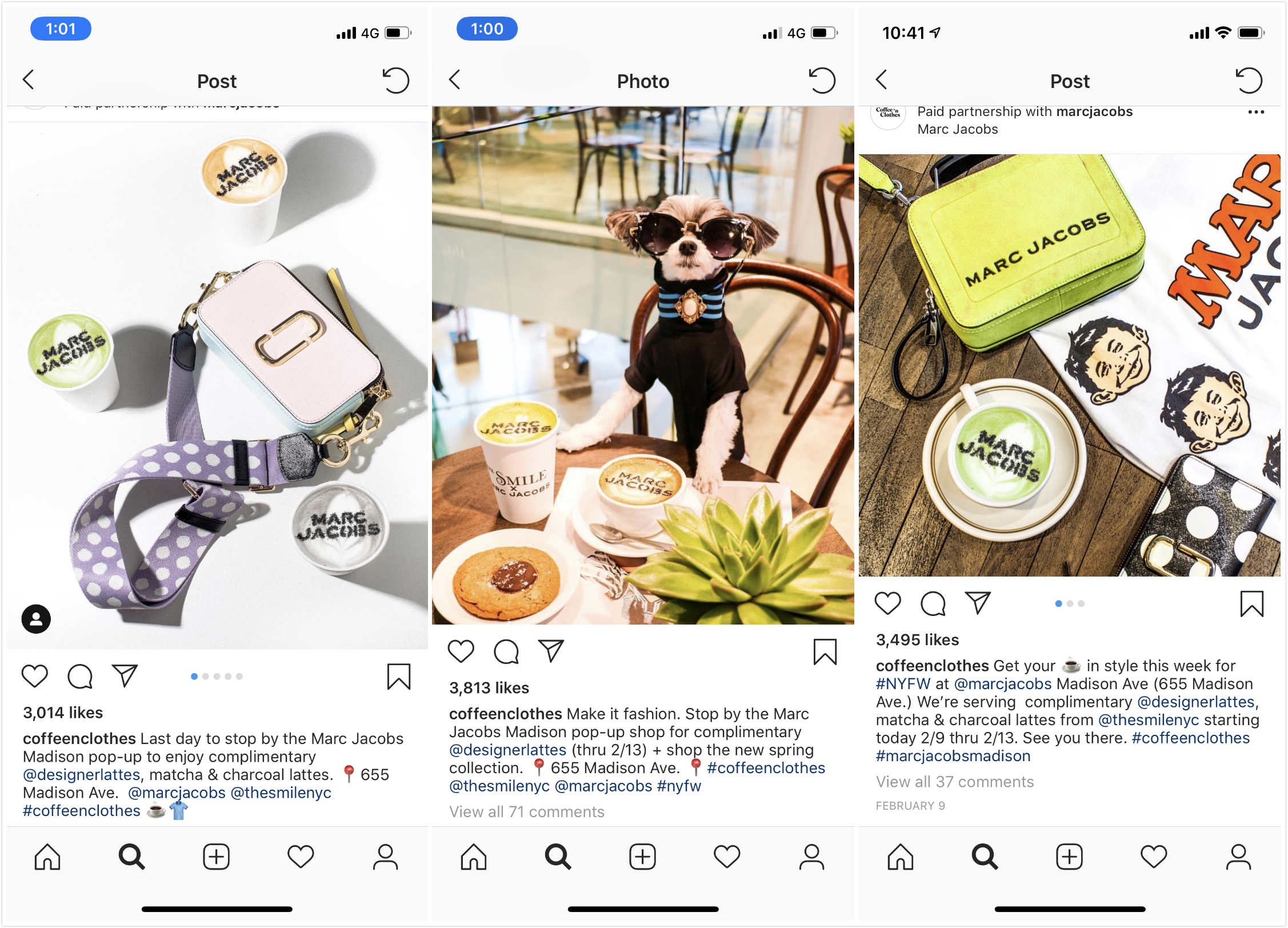 “我们用我们的招牌设计师拿铁来为门店吸引客流,”Coffee'n Clothes的创始人Ryan Glick在接受《女装日报》采访时谈起这次合作,“Marc Jacobs也用了我们的社交网络影响力来为自己在纽约时装周造势。”