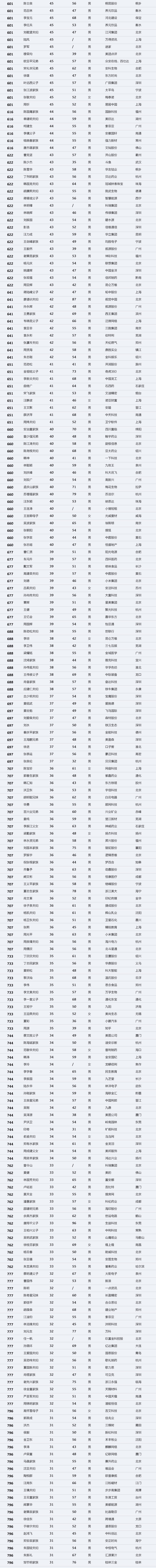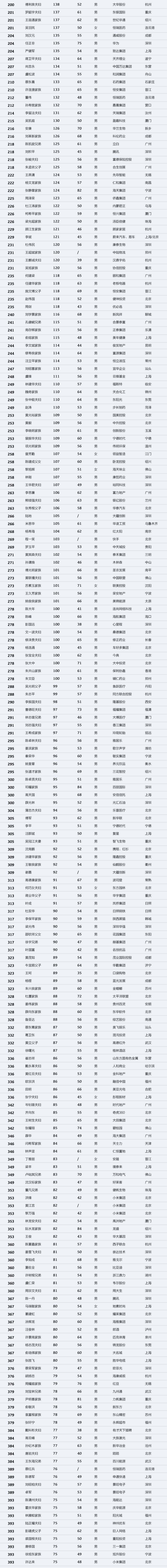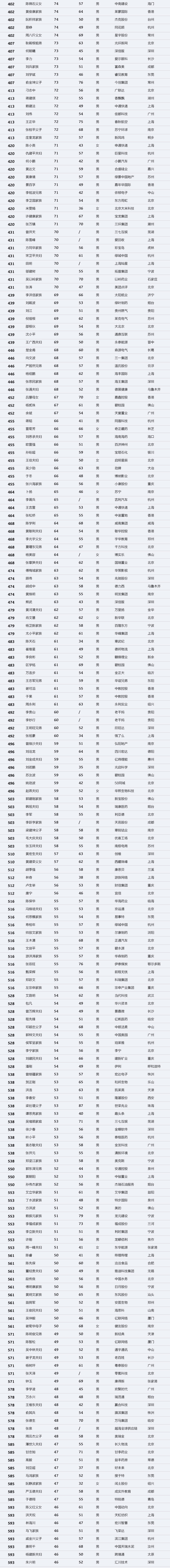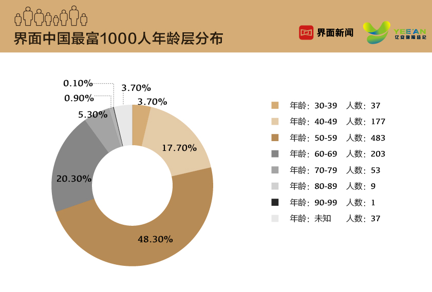 本次上榜的1000位富豪(37位未知年龄),平均年龄56岁。最年轻的是30岁的徐逸,来自2018年新上市公司哔哩哔哩。最年长的则是生益科技的唐翔千(96岁)。年龄在50-59岁的富豪共有482位,几乎占去半壁江山,人均财富100亿元;30-39岁的富豪共计37位,虽然人数占比只有3.70%,却持有6.10%的财富,该年龄段富豪人均财富达到183亿元,远高于榜单富豪平均财富111亿元。榜单中男性富豪占有绝对的优势,共有941位,女性富豪有59位。