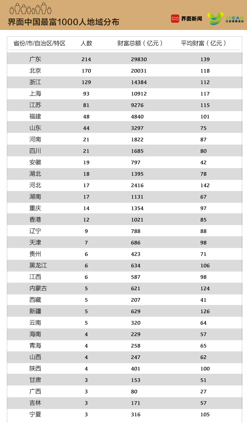 从地域上看,上榜富豪覆盖了32个省级行政区以及中国香港特区,广东的富豪数量和财富总值双第一,有214位富豪上榜,累计财富29830亿元,占榜单总财富的26.89%,平均财富139亿元,比榜单平均财富高出25.23%。接着是北京和浙江,各有170位和129位富豪上榜。