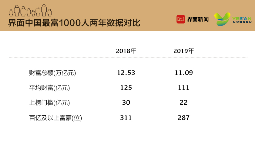 界面联合亿安保险经纪重磅推出“2019中国最富1000人”榜单,这是界面连续第二年推出该榜单。1000位上榜富豪/富豪家族的总财富达到11.09万亿(人民币,下同),平均财富111亿元,上榜门槛22亿元。百亿及以上富豪有287位,他们的财富总和占榜单总财富的69.01%。