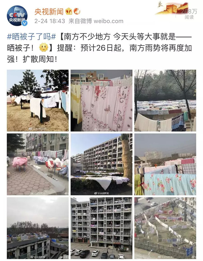 看了这些大家就应该可以理解了:为什么南方人一看到大晴天就跟逢年过节似的。所有的广场和空旷地区都洋溢着男女老少们的喜悦,所有能搭放物品的地方都挂满了五颜六色的被褥。
