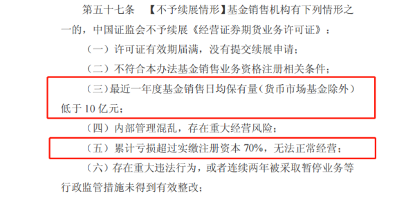 具体来看,监管层还规定了几个不予续展的量化指标,例如:最近一年度基金销售日均保有量(货币市场基金除外)低于10亿元;累计亏损超过实缴注册资本 70%,无法正常经营等等。