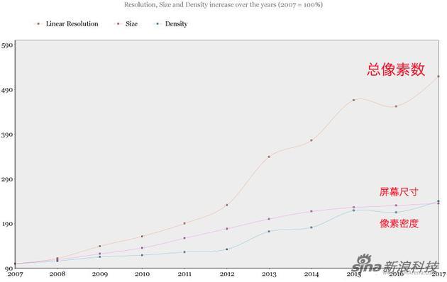 2007~2017年手机屏幕参数变化,图片来源:新浪科技