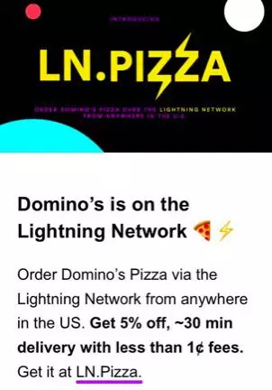在 Bluwallet 这个闪电网络钱包里,发现闪电网络已经有了不少日常应用。全美第二大披萨连锁店达美乐披萨在 2 月 14 日的时候宣布可以使用闪电网络支付,会有 95 折,手续费只有不到 1 美分。