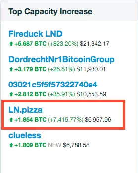 从闪电网络的浏览器上看,最近 7 天,LN.Pizza这个节点收到了 1.8 个比特币,大约 6957 美元。除了少量金额是这个节点作为传递其他交易的手续费,这 1.8 个比特币几乎都是用户通过闪电网络购买达美乐披萨的营业额。