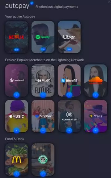 另外一款 ZAP 钱包也将内置不少支付场景,Autopay。用户可以使用这款钱包对自己喜欢的服务商进行授权,钱会通过闪电网络自动转走。对于经常使用杂志订阅,流媒体服务等等这样的用户来说,非常方便。在 ZAP 的计划商户矩阵里,几乎包含了衣食行里最主流的应用。