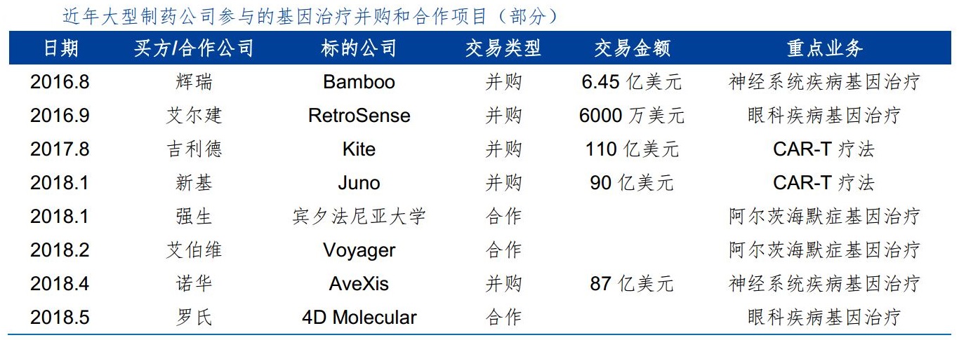 国际大型生物制药公司也纷纷通过并购或合作的方式进一步深入基因治疗领域,如辉瑞与 Bamboo、新基与Juno、诺华与AveXis等。