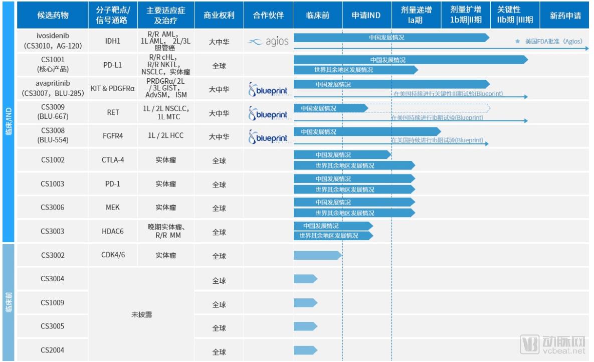 除CS1001之外,基石药业的自研管线还有4条进入了临床阶段,分别靶向CTLA-4、PD-1、MEK和HDAC6,均是抗肿瘤的靶向药物,其中较快的两种药物已经进入了Ⅰ期临床阶段。另外还有五条在研管线处在临床前阶段,具体信息未披露。除了自研药物以外,基石药业还与BluePrint获得了其三条药物管线在大中华区的商业化权利,目前这些药物在国内外都处于临床试验阶段。