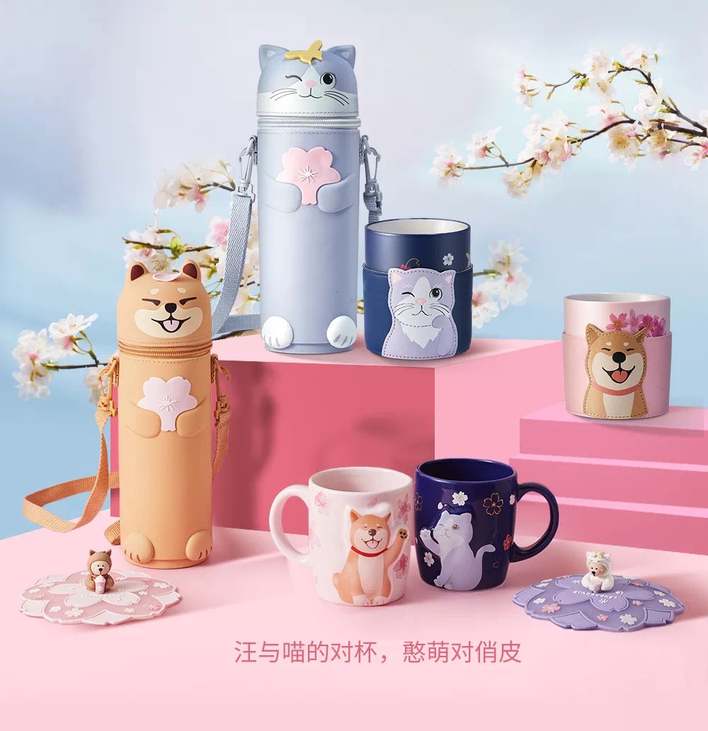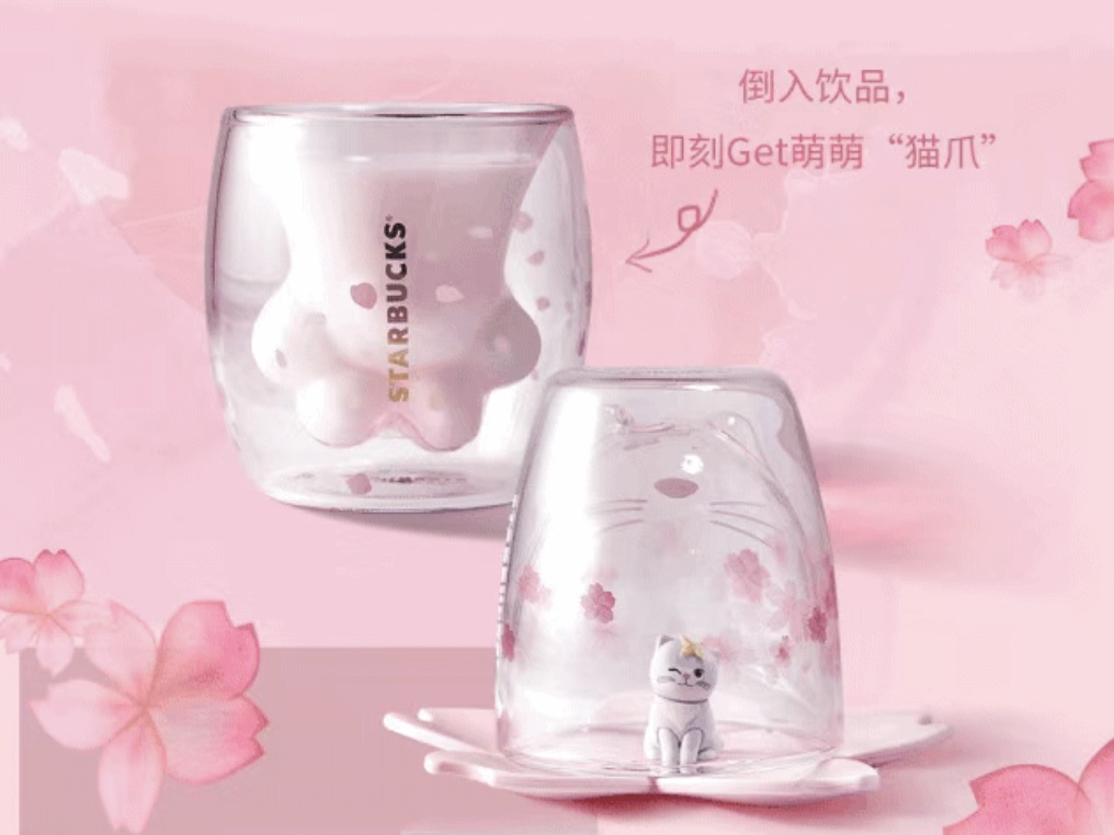 这是星巴克春季新品中的一款,透明的杯身内是猫肉球形状,倒入饮料便会看到一只猫爪。除此之外,还有不少以猫狗和春季为主题的杯子,比如透明的印有樱花的杯身中坐着一只小猫,或是杯盖上有一只立体的柴犬。