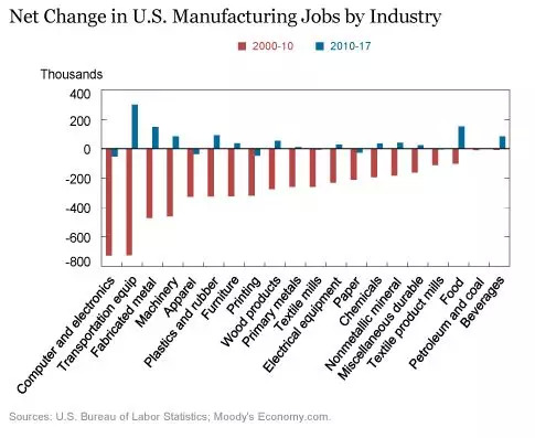 虽然制造业整体就业人数之前大幅下降,但随后略有回升,过去几年制造业中一些部门的就业人数出现大幅上升,而其他部门则持续裁员。下图显示2000-10年期间按行业划分的制造业工作岗位与2010-17年期间的净变化。